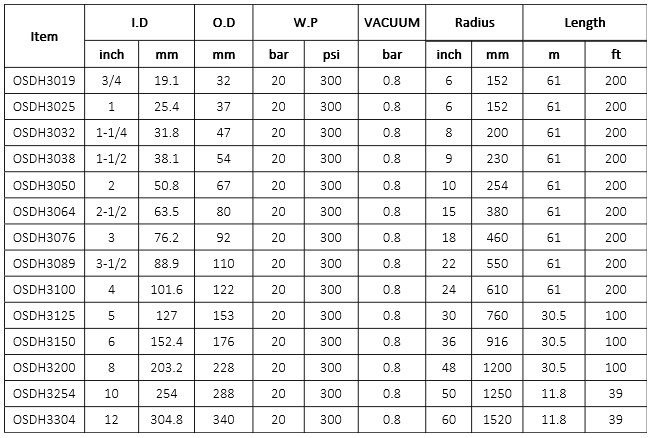 Reinforcement: Multi plies high strength synthetic fabric and steel wire helix skeleton.